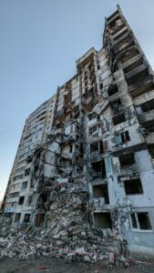 Ein besonderes Souvenir hat sich Sergey Khristich aufbewahrt: Die Trümmer einer Rakete, die nur wenige Meter von seiner Wohnung entfernt eingeschlagen ist. „Ich behalte sie für das Tribunal in Den Haag“, sagt er zuversichtlich. Bereits seit Mai 2022, kurz nachdem die ukrainische Armee das Viertel zurückerobert hatte, kehrte er zurück. „Ich habe wie ein kleiner Junge geweint, es war zu emotional“, erzählt er. Und just in dem Moment, als er vor seinem Zuhause gestanden habe, habe er abermals vor dem Beschuss in Deckung gehen müssen.