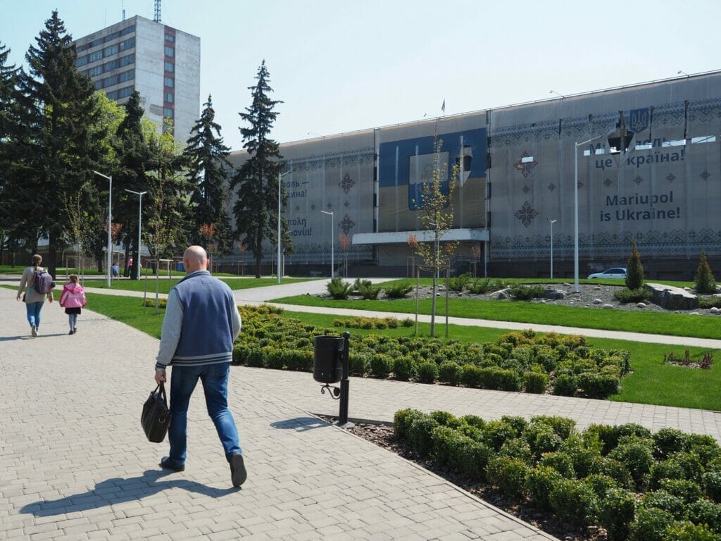 Move to the big city: Some 50 kilometres south of Chermalyk in Mariupol this static warfare is barely present. The city is secured with military checkpoints from all access roads, and in the city area as well as in the busses, soldiers can be seen. But in the city centre life is pulsating just like in Kyiv or Berlin. The burnt-out former town hall is one of the memories, which remind of the riots which happened once. “Mariupol is Ukraine!,” is written in Cyrillic and in Latin letters on one of the banners, which is already tattered a bit. The park in front of it is clean and groomed, families are walking along the pathways, on the benches some seniors take place and enjoy the sun at noon, teenagers shoot selfies.