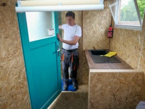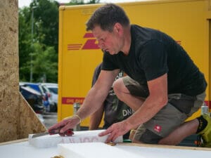 Interessiert zeigen sich auch immer wieder Passant:innen, die vor und nach ihrem Einkauf an der Baustelle vorbeilaufen und das Geschehen beobachten. Wer Lust hat, kann auch selbst ein paar Minuten Hand anlegen, die OSB-Platten zurechtsägen und mit dem Gerüst verschrauben, die Wände mit Styropor und Rettungsdecken isolieren oder Tür und Fassade streichen. „Es gibt keine Hierarchie, das ist Teamwork“, beobachtet Sabina beeindruckt.