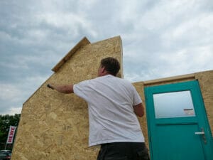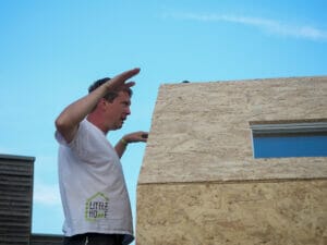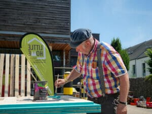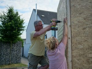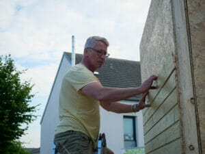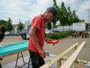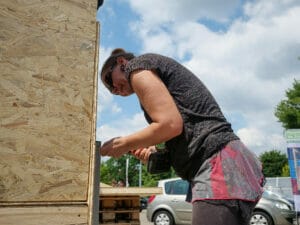 Mit den vielen helfenden Händen nimmt das neue Little Home am Nachmittag schon Gestalt an, als der Boden auf dem Hänger liegt und die Wände darauf verschraubt werden. Ganz reibungslos läuft die Bauaktion nicht. Beim Streichen der Fassaden ärgert sich Uwe über mehrere gesplitterte Leisten. „Wir müssen mit dem arbeiten, was wir haben“, beschwichtigt Lüdecke.