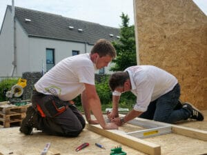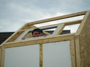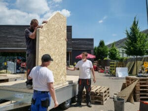 Als die Tür nicht in den Rahmen passt, muss der noch einmal nachgesägt werden. Das verzögert den Zeitplan. Und weil das in die Dachschräge eingebaute Kellerfenster undicht ist, muss im Nachhinein noch ein passendes Dachfenster eingesetzt werden. Und kurz vor Fertigstellung des Rohbaus der Schreck: Die OSB-Platten gehen aus. „Wir haben anderthalb Paletten OSB-Platten geholt, das sollte reichen“, sagt Lüdecke verblüfft. Doch kommt er nicht darum herum, am Ende noch zwei weitere nachzukaufen.