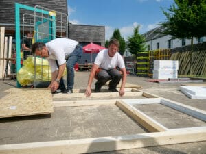 Von einem kleinen Haus ist am Morgen der Bautages noch nichts zu sehen. Nur der blanke Anhänger steht in einer Parklücke, auf einer Freifläche reihen sich Grobspanplatten-Platten (OSB) an Holzpfosten und Styroporplatten. Dazu kommen Leisten für eine Holzfassade, zwei Fenster, eine Eingangstür und Farbe. Also alles, was für ein Little Home so nötig ist. Das dafür notwendige Werkzeug in Form von Sägen, Schleifgeräten, Hämmern, Schraubern und Pinseln stellt der Verein ebenfalls.
