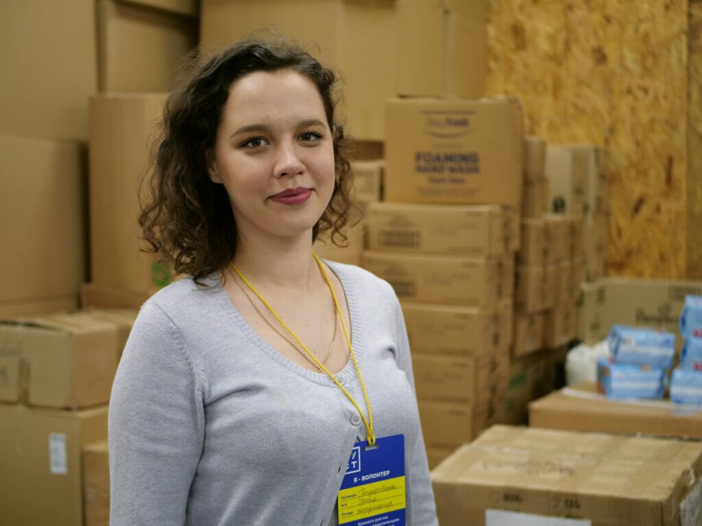Inmitten dieser unübersichtlichen Lage behält eine Gruppe junger Menschen einen kühlen Kopf. Das frühere Theater, dient nun als Hilfszentrum. Bis zu Beginn der russischen Großoffensive hatte hier das Jugendzentrum Mol Centr Dnipro seine Räume, die es nun für die Koordination nutzt. Das Foyer haben die Aktiven zur Kleiderkammer umfunktioniert. Im Eingangsbereich stapeln sich Lebensmittelkisten. Ein unterirdischer Verbindungstrakt dient als Luftschutzbunker. In Büros lagern Lebensmittel. In einem weiteren Verbindungstrakt wird der Platz eng – so viele fertige Kartons liegen hier aneinandergereiht. In den kommenden Stunden sollen sie an die Adressat:innen gehen. Doch leer wird es hier selten. „Die ganzen Kartons gehen an einem Tag raus“, erzählt Diana Spichak. Die 17-Jährige ist eine der vielen jungen Ehrenamtlichen hier. Im Video führt sie durch die Räumlichkeiten.