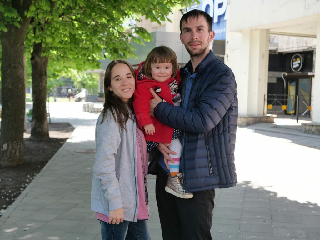 Das haben auch Polina Zoicseva und Sergey Len mit der einjährigen Tochter Emilia erfahren. Bevor sie Mitte März aus Rubischne (Oblast Luhansk) flüchteten, versteckten sie im Keller. „Wir haben Bomben und Feuer gesehen und es mit Schnee gelöscht“, erzählt die 23-jährige Zoicseva. Nach zweitägigem Aufenthalt in Kramatorsk brachten die Busse sie schließlich nach Dnipro. Dort vebrachte die Familie zwei Wochen in einer Unterkunft und lebt seitdem in einem Hotel.