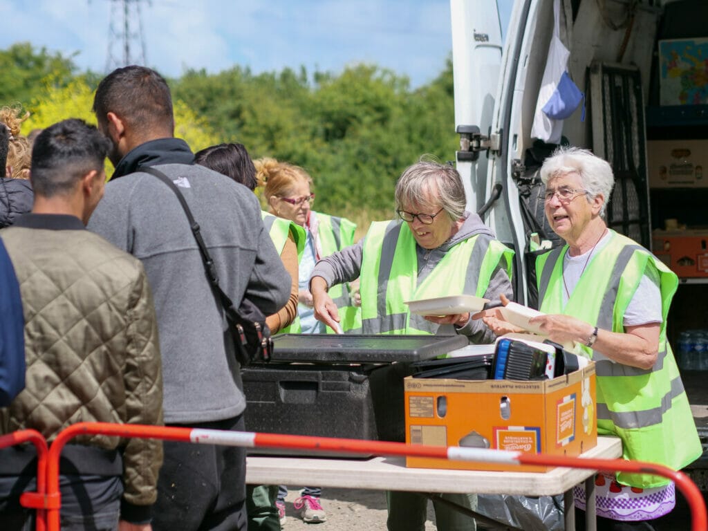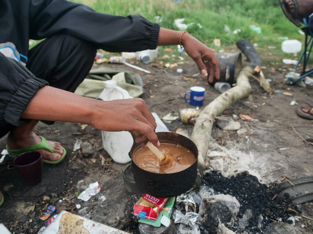 Guy Dequeker aus Lille ist seit 15 Jahren ehrenamtlich in Nordfrankreich tätig und verteilt heute mit der NGO Salam warme Mahlzeiten. Wenn seine Frau Regine die Schlange organisiert und die Löffel verteilt, grüßt man sie hier mit „Bonjour Mama“. Täglich werden hier rund 300 Mahlzeiten serviert, die größtenteils von Einheimischen und lokalen Unternehmen gekocht und gespendet werden. „Ich bin mit meinem Land nicht einer Meinung“, kritisiert der 81-Jährige die fehlende staatliche Unterstützung für die Menschen hier: „Unser Land macht es nicht, wir machen es.“
