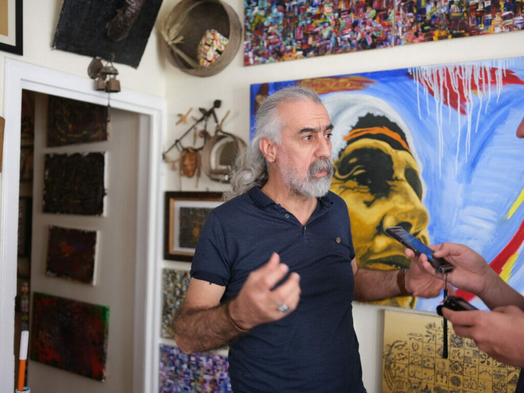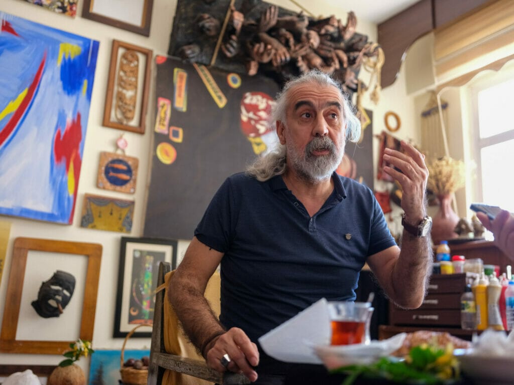 Für das Gespräch lädt Gökhan Aslan in sein lichtdurchflutetes Atelier in Diyarbakir; in den Nachbarräumen arbeiten weitere Künstler; der größte ist für Seminare gedacht. In der Mitte seines kleinen Atelier-Raumes steht ein kleiner Tisch, an den sich das Trio setzt; dazu serviert er Tee und Gebäck. Im Hintergrund läuft klassische Musik; immer wieder dieselben Melodien. Schon die Exponate in dem Raum bilden ein breites Spektrum an Kunst ab, die Aslan über Jahre für sich entdeckt hat. „Kunst ist offen, sie steht über der Politik“, sagt er.