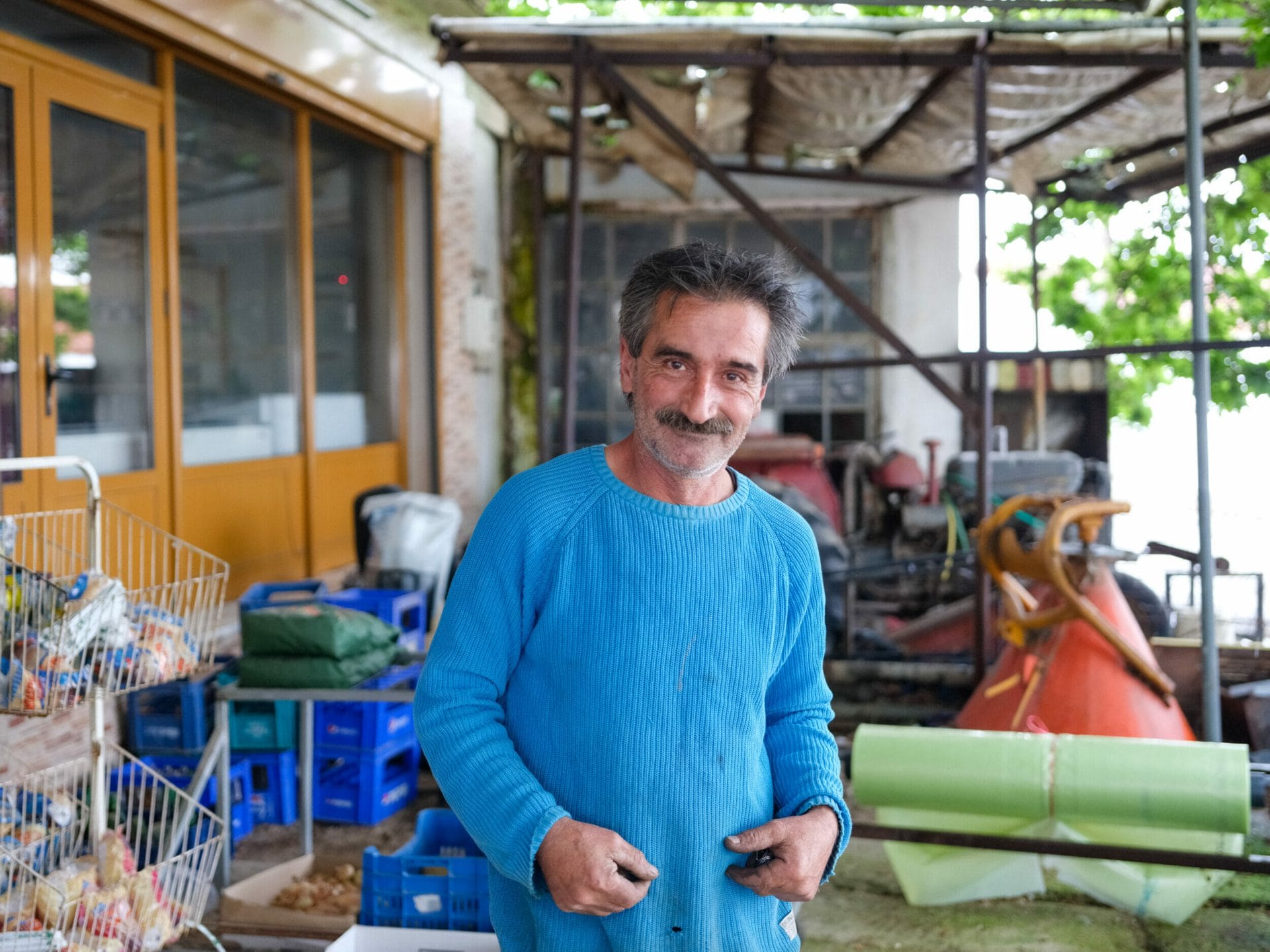 In der Region Alexandroupolis, etwa 50 Kilometer westlich von Feres und der Grenze zur Türkiye, sind entlang der Straßen viele Moscheen zu sehen, von denen einige sehr nahe an orthodoxen Kirchen gebaut sind – sie symbolisieren den gemeinsamen Alltag griechischer Bürger:innen mit unterschiedlichen Religionen, wie Koulkovinis beschrieb. Seit der osmanischen Zeit blieb eine türkischsprachige, eine muslimische Gemeinschaft in der Region. Salih Dalli ist einer von ihnen – er lebt im Dorf Aratos, rund 80 Kilometer von der Grenze zur Türkei entfernt. Er verlässt einen kleinen Laden. Seine Hände und Finger sind groß, sie sehen geschwollen aus und sind vom Öl verschmutzt. Ein Beweis für seine harte Arbeit mit Eisen.