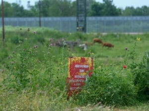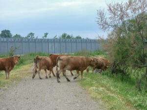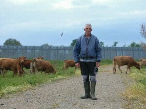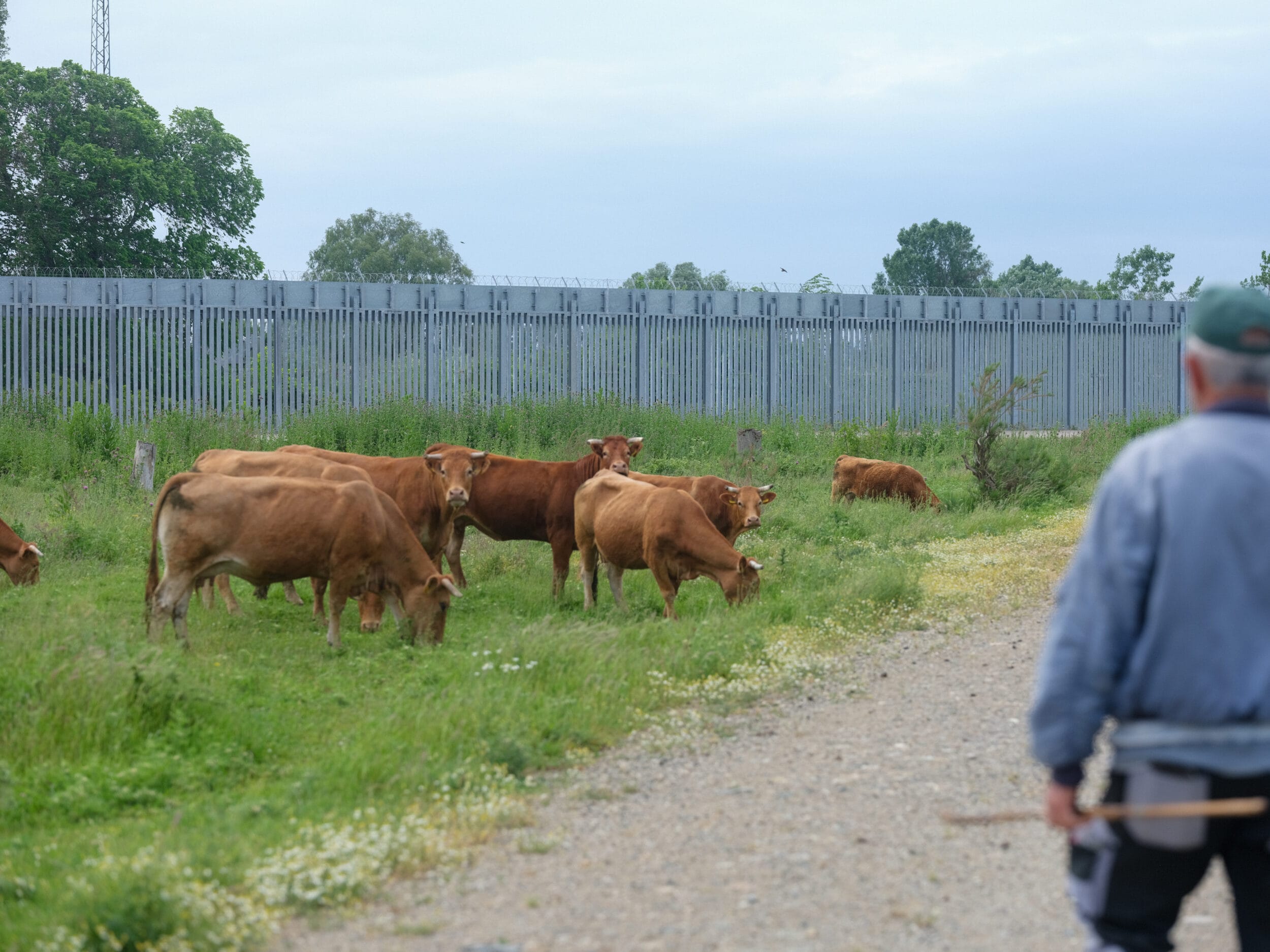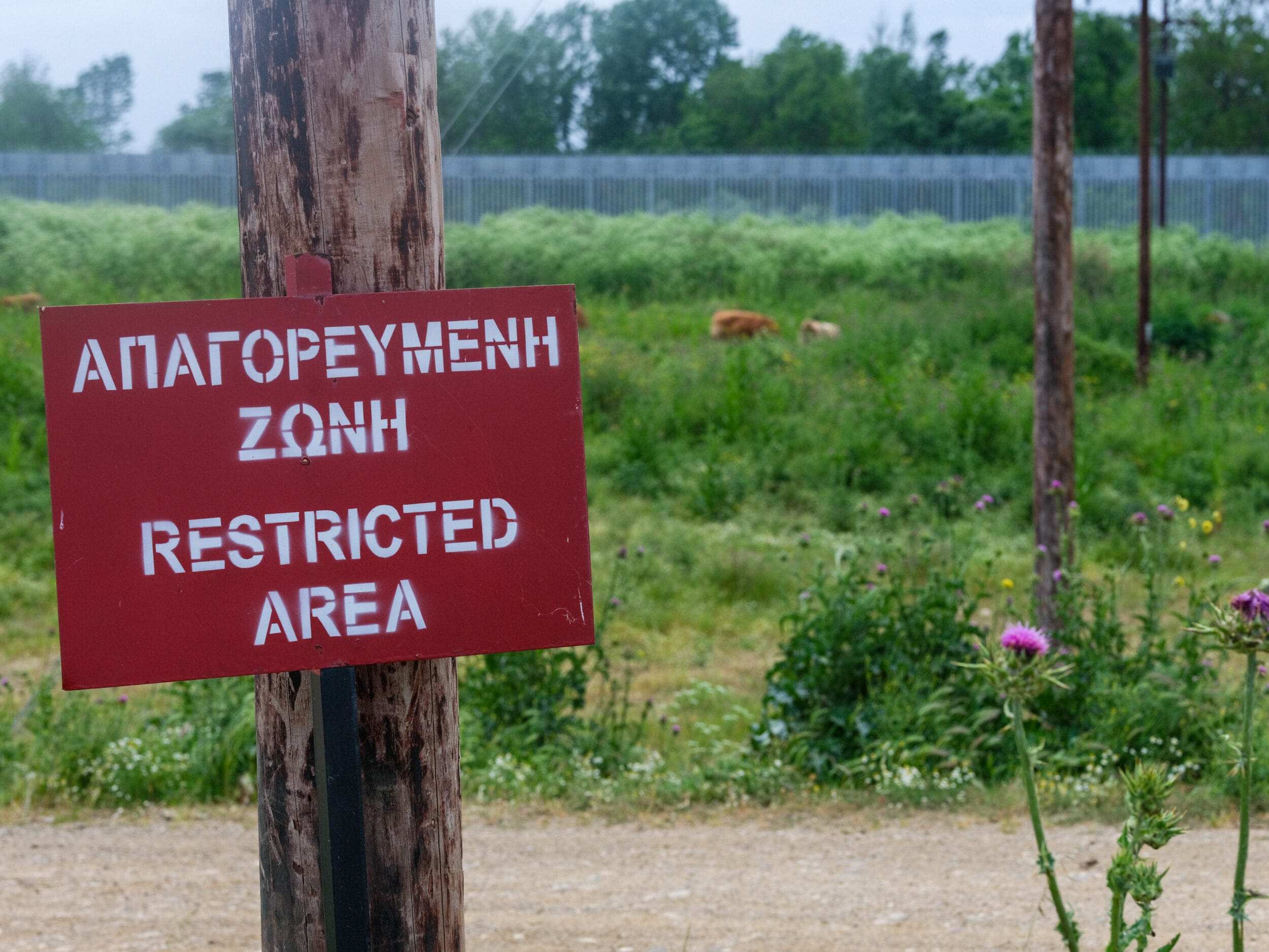 Genau an dieser Grenzmauer, zwischen Blumen und hohem Gras, läuft eine Herde Kühe hinter ihrem Bauern her. Simeon Xalamanbidis, der die Mauer täglich mit seinen 50 Kühen sieht, scheint von ihr nicht beeindruckt zu sein. “Ich war schon immer hier”, sagt er, genauer gesagt seit rund 50 Jahren, “Ich bin Hirte, ich kann auch in die verbotene Zone gehen.” Man bräuchte eine Genehmigung, um hier zu sein, fügt er hinzu. Er schüttelt den Kopf über die Frage, ob die Mauer dazu beigetragen hat, die Migrant:innen fernzuhalten: “Wenn sie hier nicht rüber können, kommen sie woanders durch, wo es keine Mauer gibt.” Aber er selbst hatte keine schlechten Erfahrungen mit den Menschen, die auf irregulären Wegen in die Gegend kamen.
