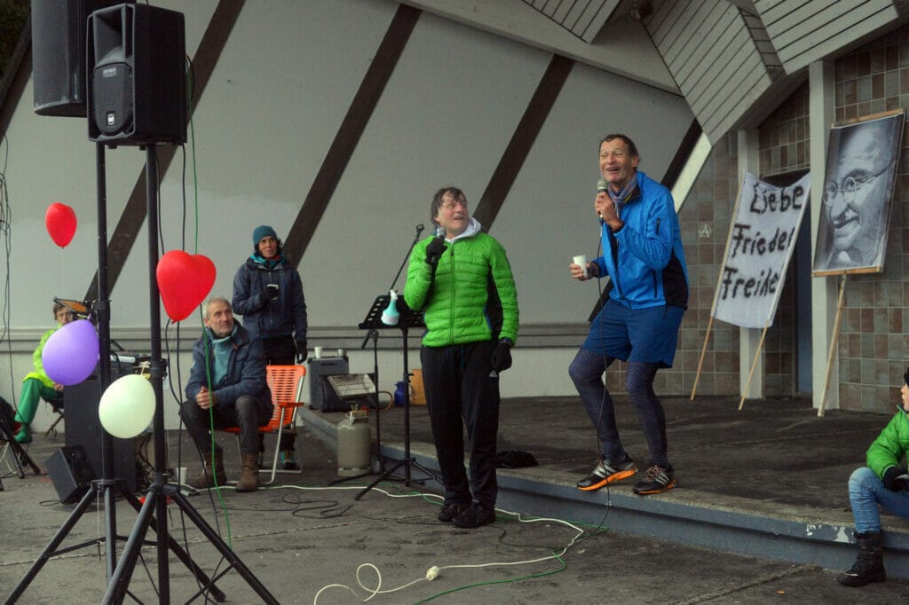 Sein Gesicht blickte den Anwesenden in Überlebensgröße von der Bühne entgegen, als eine der ersten Demonstrationen von Klardenken Schwaben in Friedrichshafen stattfand: Mahatma Gandhi. Auch anderswo war der Anführer der indischen Unabhängigkeitsbewegung und Vertreter der Gewaltfreiheit, oft lediglich sein Gesicht, als Banner, Plakat oder Sticker immer wieder zu sehen. Manchmal gab es ein Zitat dazu.