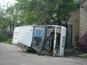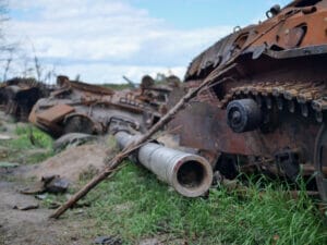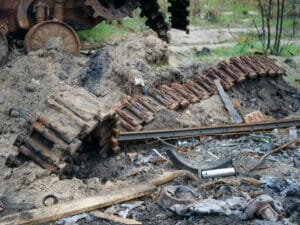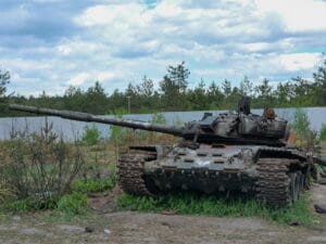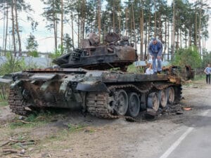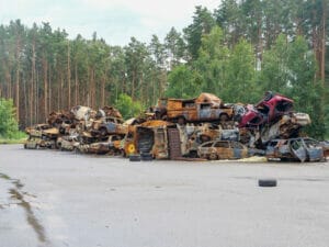 Wie erbittert sich beide Seiten hier bekämpft haben, zeigt sich auch 20 Minuten südöstlich von Irpin, zwischen Zabuchchya und Dmytrivka. Am Straßenrand liegt gleich ein Dutzend Metallskelette, russische Panzer und andere Militärfahrzeuge sind hier von ukrainischen Truppen gestoppt und später zurückgedrängt worden.