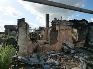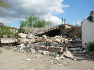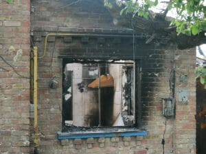 Besonders schwer betroffen von den Kampfhandlungen war ein Wohngebiet im Nordosten Irpins an der Hostomel’s’ke Hwy, die zu keinem Zeitpunkt von russischen Truppen eingenommen werden konnte. Die modernen Hochhäuser mit Parkanlagen, Sitzbänken und Kinderspielplatz nahe eines Militärkrankenhauses liegen komplett in Trümmern, dort steht gerade Vitali und bietet einen Rundgang durch das deutlich ärmere Viertel auf der gegenüberliegenden Straßenseite an, in dem er aufgewachsen ist; gebürtig kommt er aus der Oblast Luhansk. „Viele sind nach der Explosion in Tschernobyl hier hergekommen“, erzählt er. Nach der Reaktorkatastrophe im Jahr 1986 ist es nun der Krieg, der hier Tausende Menschen vertrieben hat.