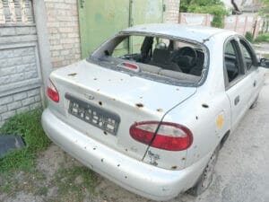 In einer Seitenstraße stoppt Vitali, mehrere zerschossene Fahrzeuge stehen darin. „Hier ist der ukrainische Panzer gestanden“, deutet er in Richtung eine der vorderen Garagen. Weiter hinten und an der Kreuzung findet er dann auch die zwei Krater durch den Artillerie-Beschuss, von denen er zuvor erzählt hat. „Ein Schuss ist über die Häuser geflogen und hat ein Haus weiter hinten getroffen“, führt er weiter aus.