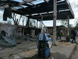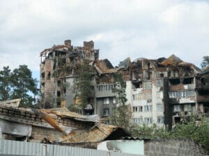Willkürlich hätten die russischen Panzer hier auf Wohngebäude geschossen, erzählen Anwohner:innen von Iprin. Im gesamten Stadtgebiet finden sich kleine und große Einschusslöcher, zerborstene Fenster, abgesplitterte Fassaden und Brandspuren prägen das Bild der einst rund 47.000 Einwohner:innen zählenden Stadt. Ein Einkaufszentrum, früher mit Kino und Bowling-Anlage, ist kaum mehr wiederzuerkennen.