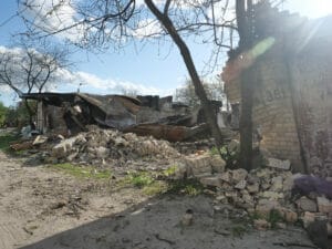 Kurz nach Beginn des Rundgangs fahren mehrere Autos in die kleine Siedlung – Rückkehrer:innen. Vitali empfängt seine langjährigen Nachbar:innen mit herzhaften Umarmungen. Die Wiedersehensfreude weicht beim Anblick der Zerstörung jedoch schnell dem Entsetzen. Noch im Auto hält sich eine wartende Beifahrerin die Hand vor Mund. Bei mehreren Menschen aus der Gruppe lassen sich feuchte, geschwollene Augen erkennen. Die Heimat in Trümmern sehen – kein leichter Anblick. Viel dürften sie auch vor dem russischen Angriff nicht gehabt haben. Aber selbst das haben sie jetzt verloren.