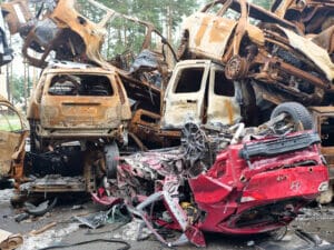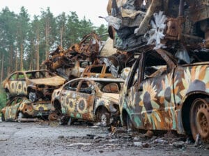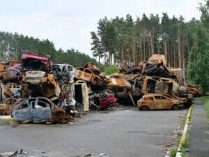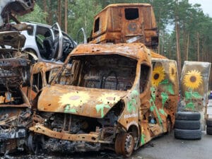 An der Stadtgrenze Irpins, von der Hauptstadt Kyjiw kommend, zeugt auch ein Autofriedhof vom erbitterten Krieg. Hier stoppten die ukrainischen Truppen den russischen Vormarsch, bis sich der Agressor zurückzog.