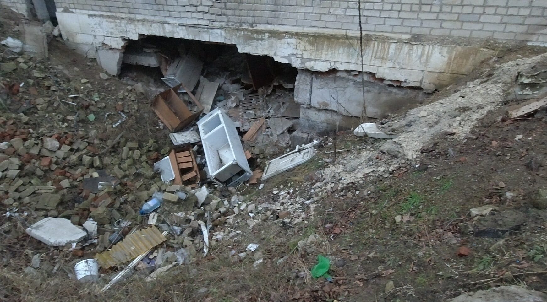 Beschädigtes Gebäude mit eingestürzter Wand und Trümmern, darunter Haushaltsgeräte.