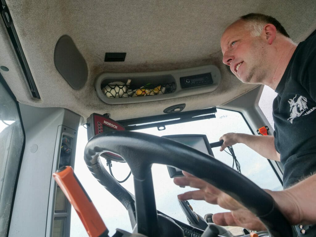Ganz rund läuft die Technik noch nicht, doch mit Routine und Geschick verrichtet Dihlmann seine Arbeit auf dem hügeligen Gelände. Selbst als sich der Trekker auf rund 45 Grad neigt und die Schwerkraft im Fahrerhaus zu wirken beginnt, bleibt er gelassen. „Zwillingsräder“, kommentiert er lächelnd; bei solchen Steigungen würden allerdings auch manche Mitarbeiter passen. Mit der gleichen Ruhe legt er sein Smartphone beiseite, als er die Meldung über den Luftalarm bekommt. „So eine Rakete kostet mehrere Zehntausend Dollar, da wird doch Putin, der eh kein Geld hat, sie hier nicht abwerfen“, sagt er.