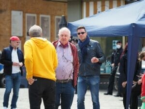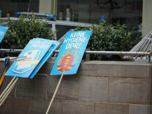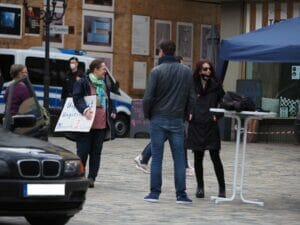 Kaum zurück auf der Bank – just als die Kundgebung beginnt und wir die Redebeiträge dokumentieren wollen – kommt der Polizist mit einem Kollegen. Sie fordern uns und vier ebenfalls auf den Bänken sitzenden Passant:innen auf, als Unbeteiligte der Kundgebung die Veranstaltungsfläche zu verlassen. Der Platz ist weitgehend leer, alle sitzen weit Abseits des Geschehens.