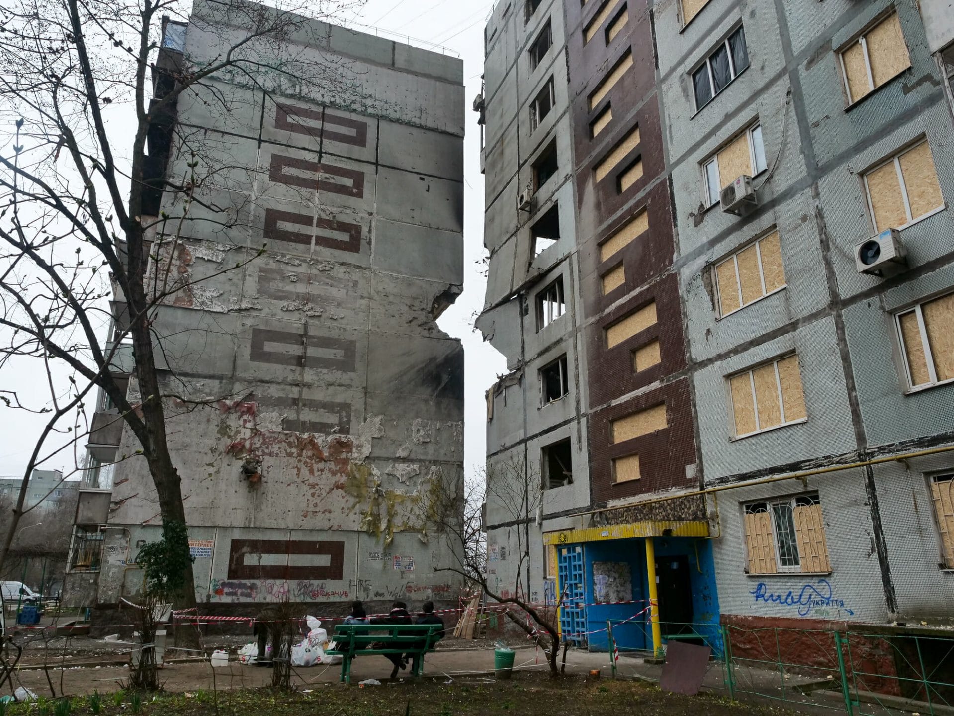 Irina, 62, und Yury, 74, sitzen wenige Tage später auf der Bank vor dem Eingangsbereich des Gebäudes, das kurz zuvor noch ihr Zuhause war. Freiwillige helfen ihnen, ihre Sachen aus dem neunten Stock zu holen. Es gibt keinen Strom – der Aufzug funktioniert nicht. Einige Stockwerke des Gebäudes sind jetzt zerstört und das übrige Haus kann jeden Moment einstürzen. Von unten ist zu erkennen, wie die Explosion und die Druckwelle fast noch weitere Stockwerke aus dem Gebäude gerissen hätten. Um einige Zentimeter ragen die Betonplatten am Einschlagsort über die Fassade hinaus. An den Drahtgeflechten hängen einzelne Brocken lose.