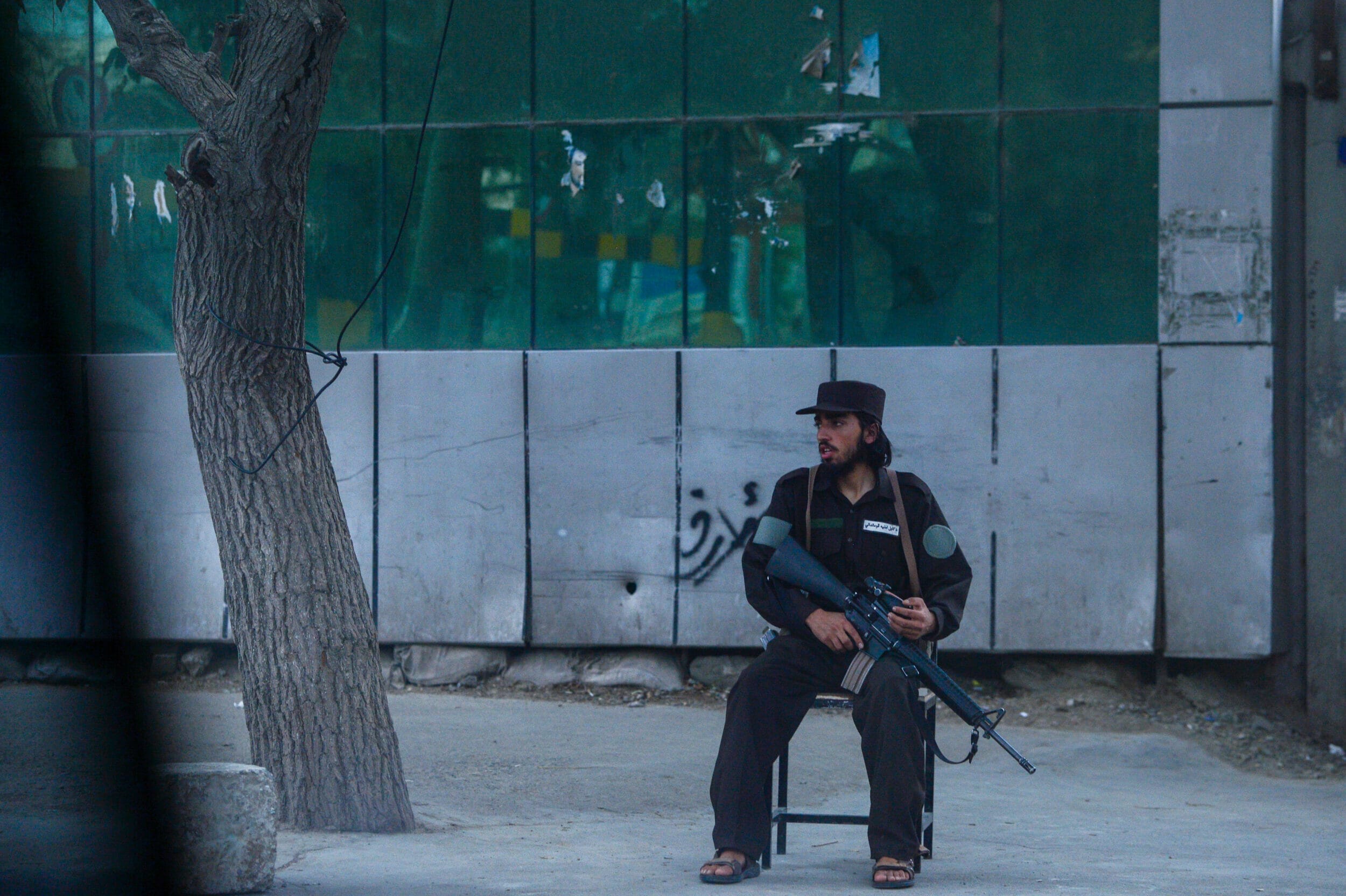 Ein Mann sitzt auf einem Stuhl neben einem Baum.