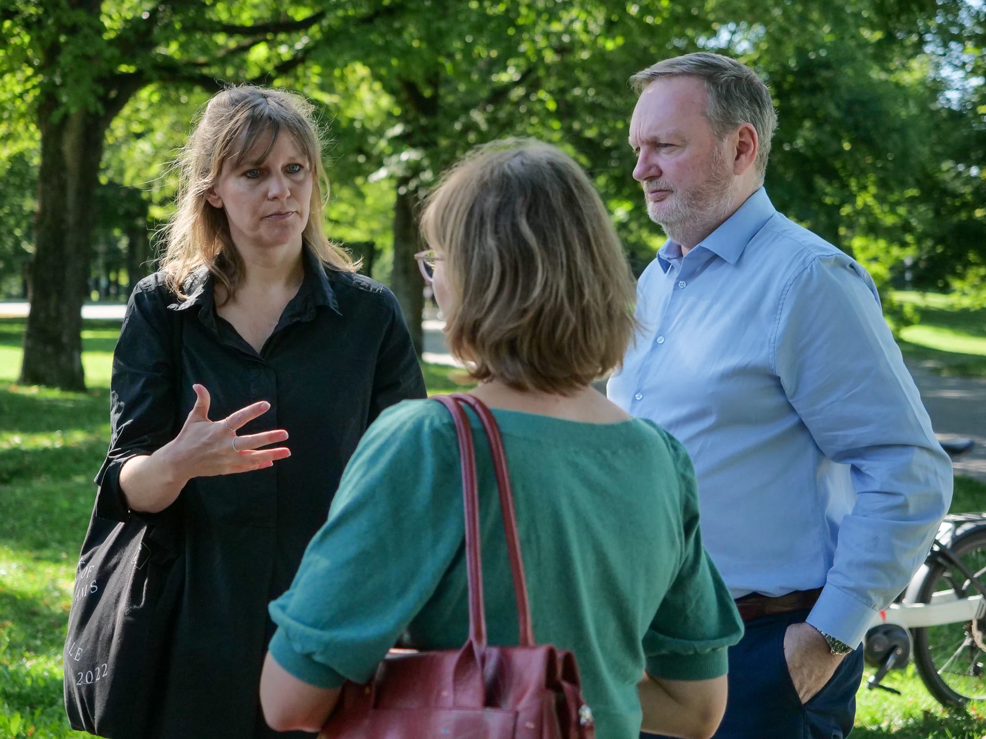 Drei Personen unterhalten sich in einer ruhigen Parkumgebung.