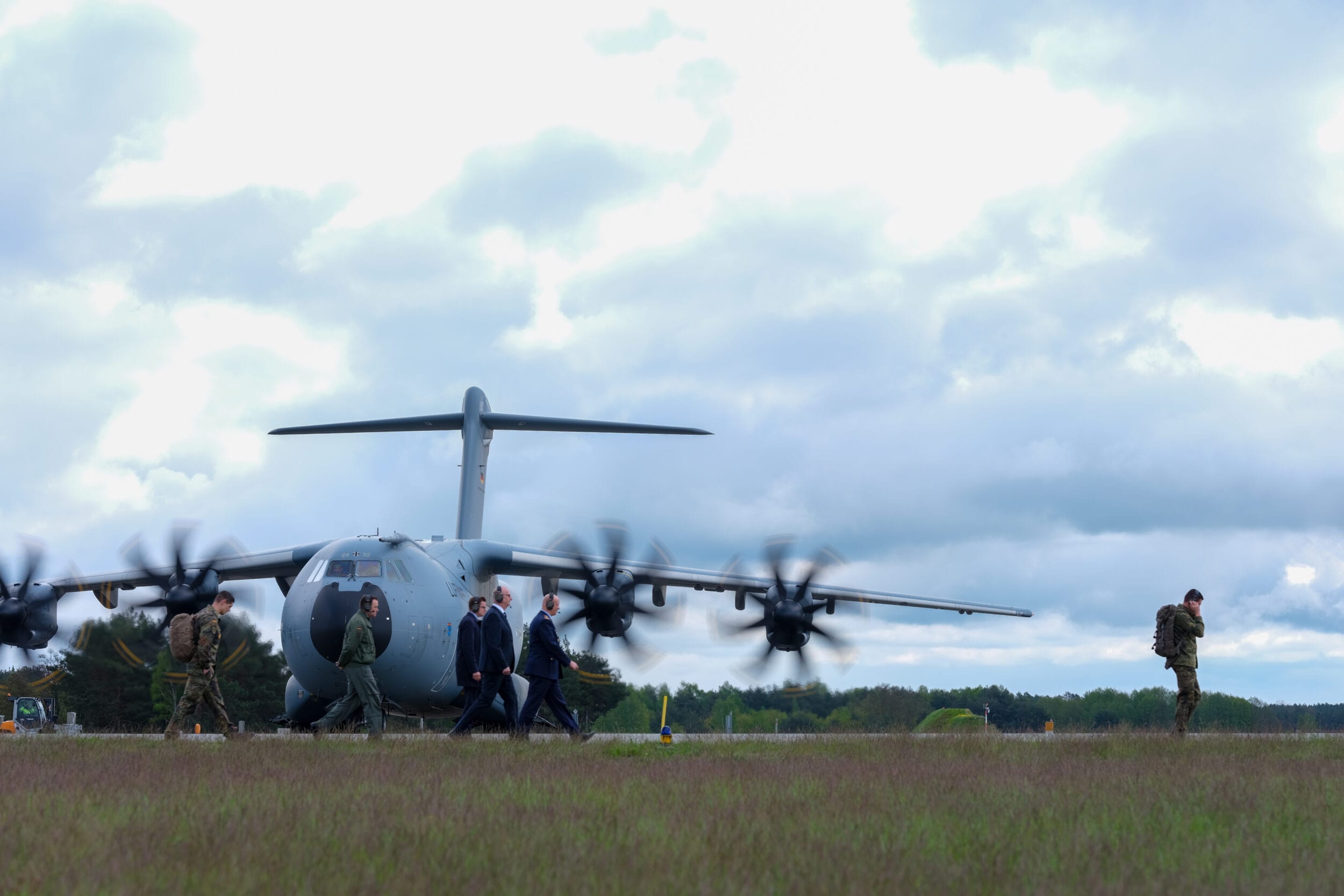 Ein großes Militärflugzeug steht mit laufenden Triebwerken auf einer Landebahn. Mehrere Personen gehen in der Nähe des Flugzeugs und ein Soldat läuft allein auf dem Gras rechts. Der Himmel ist bewölkt.